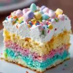 A vibrant and flavorful Easter Poke Cake topped with whipped cream and colorful gelatin, perfect for festive celebrations.