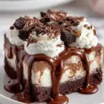 A delicious dessert combining fudgy brownies and creamy ice cream layers, drizzled with chocolate sauce and topped with whipped cream.