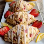 Deliciously flaky strawberry scones topped with a sweet and tangy lemon glaze, perfect for breakfast or an afternoon snack.